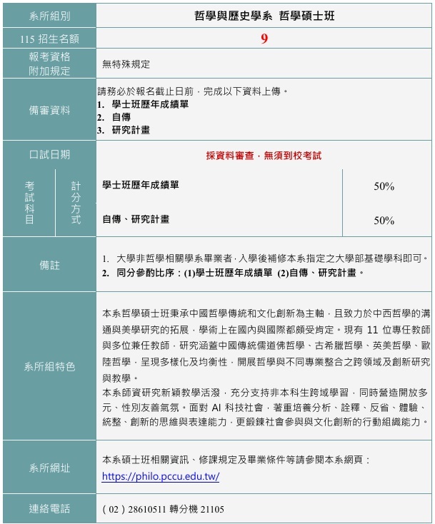 115學年度哲學與歷史學系 哲學碩士班考試入學招生(報名時間:即日起至3/3)